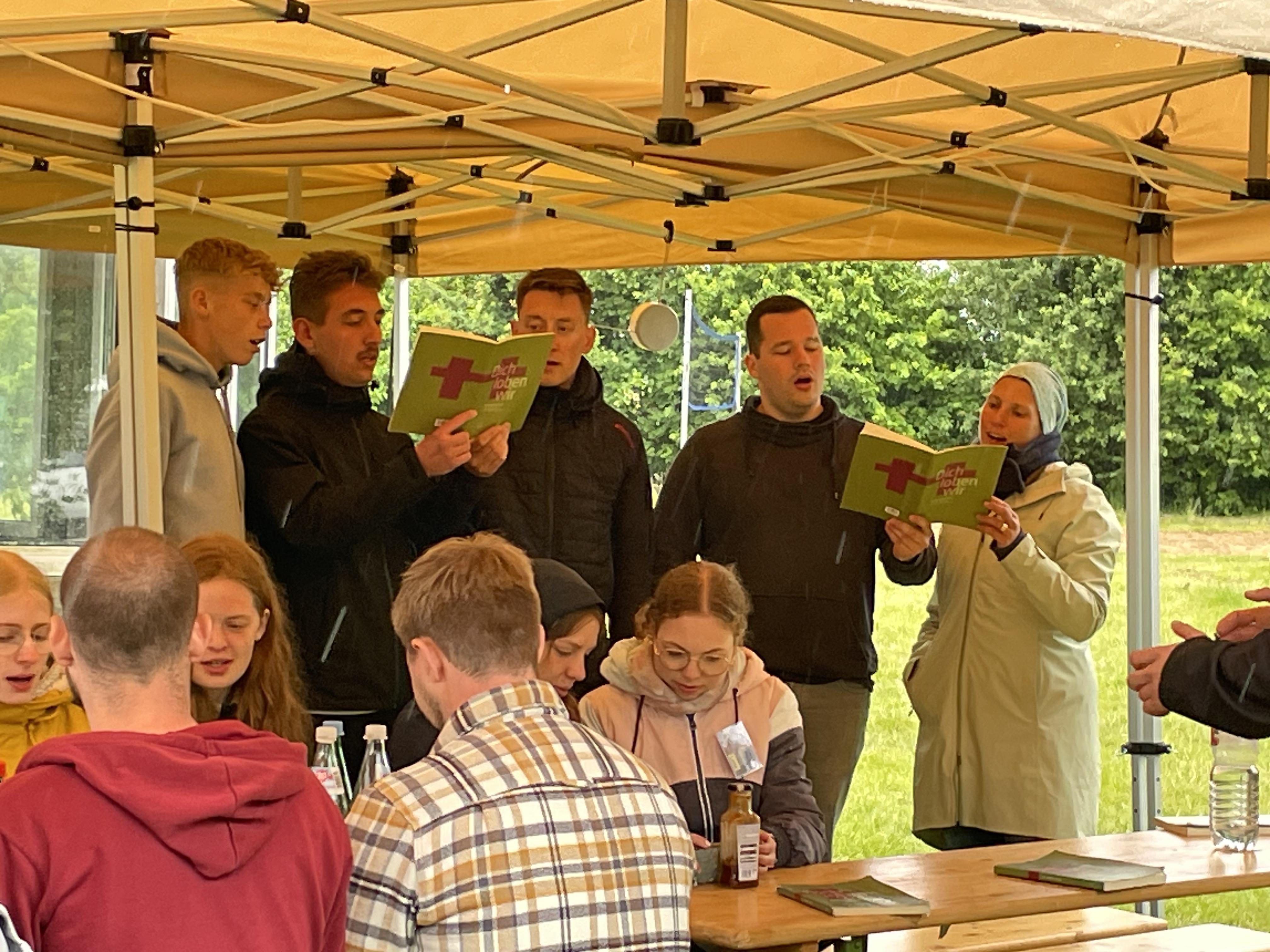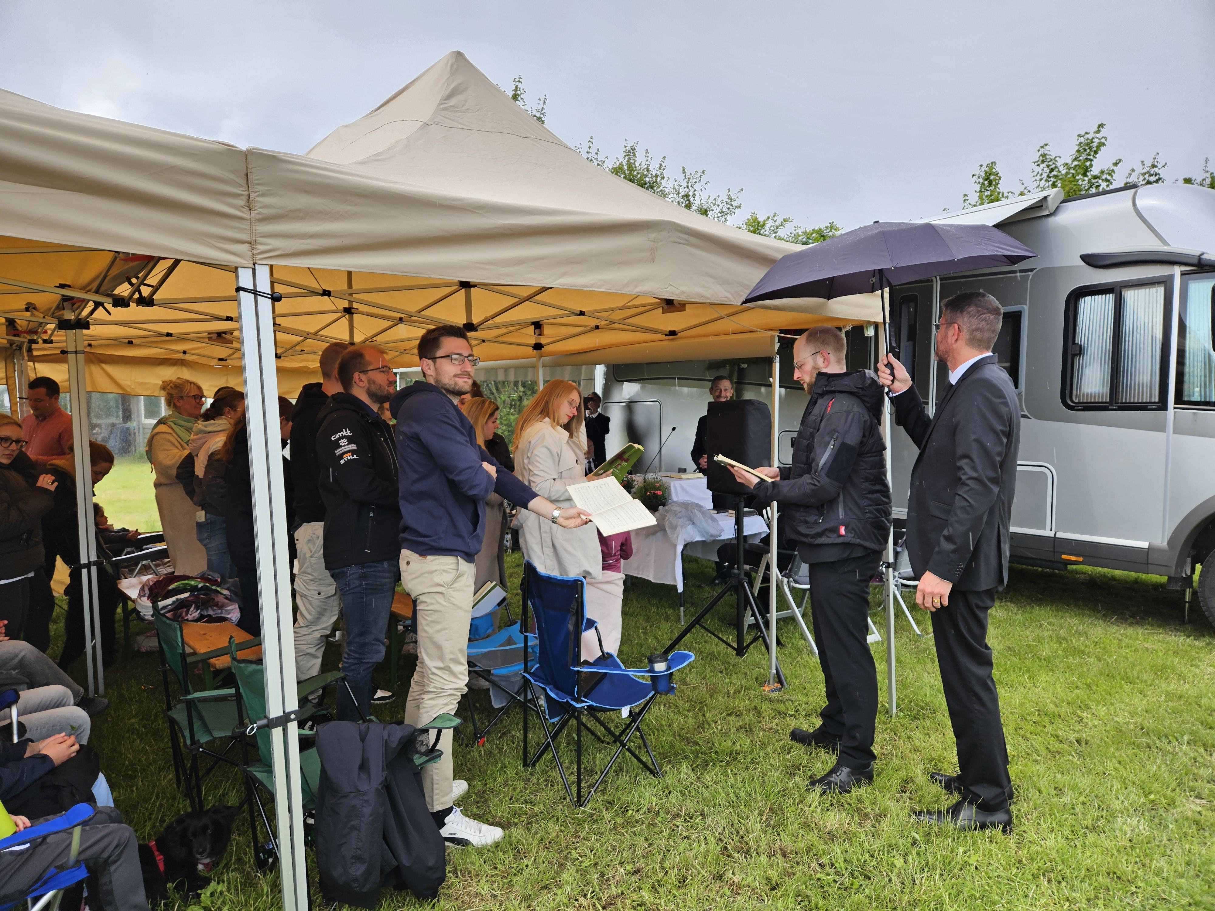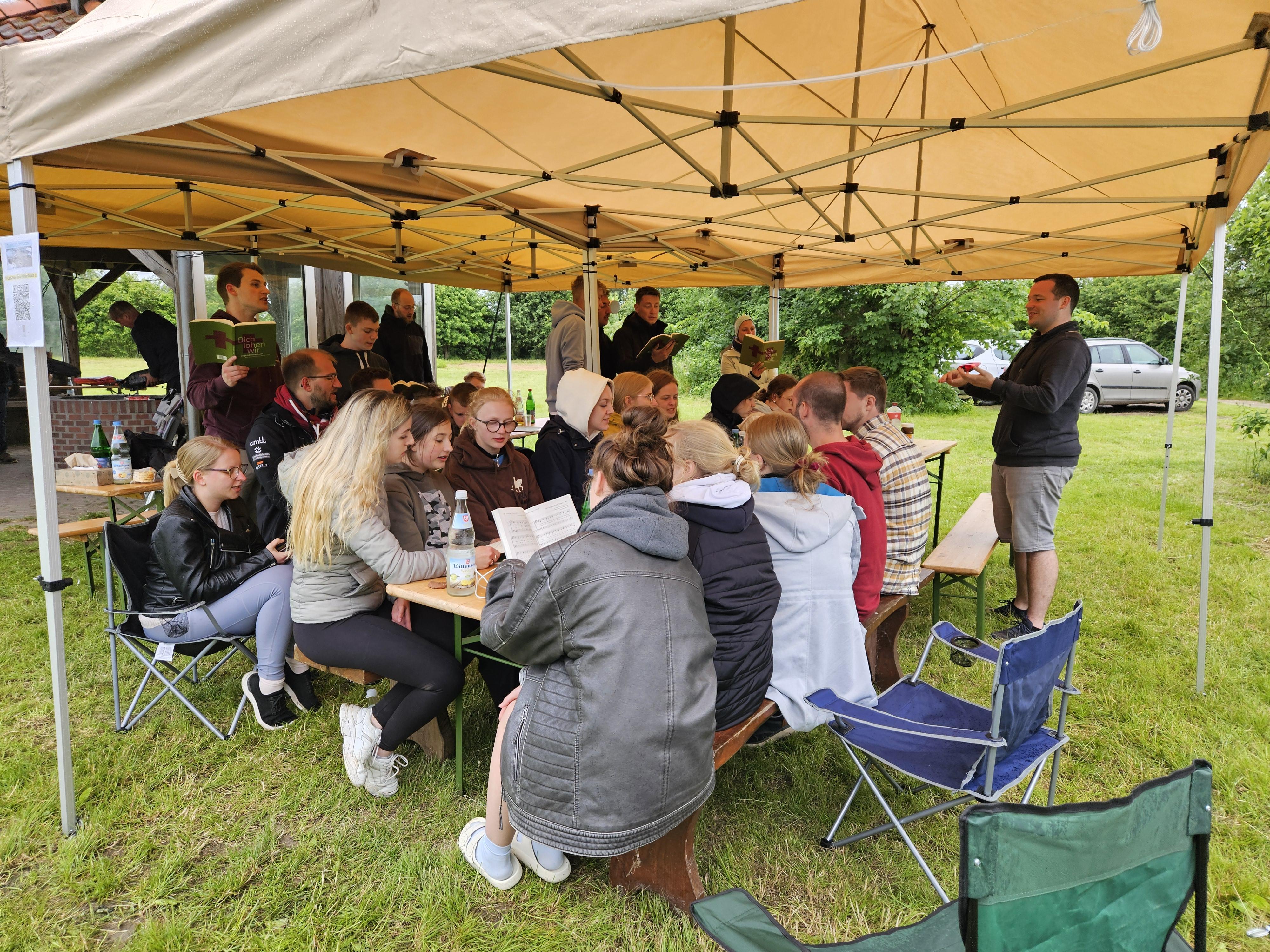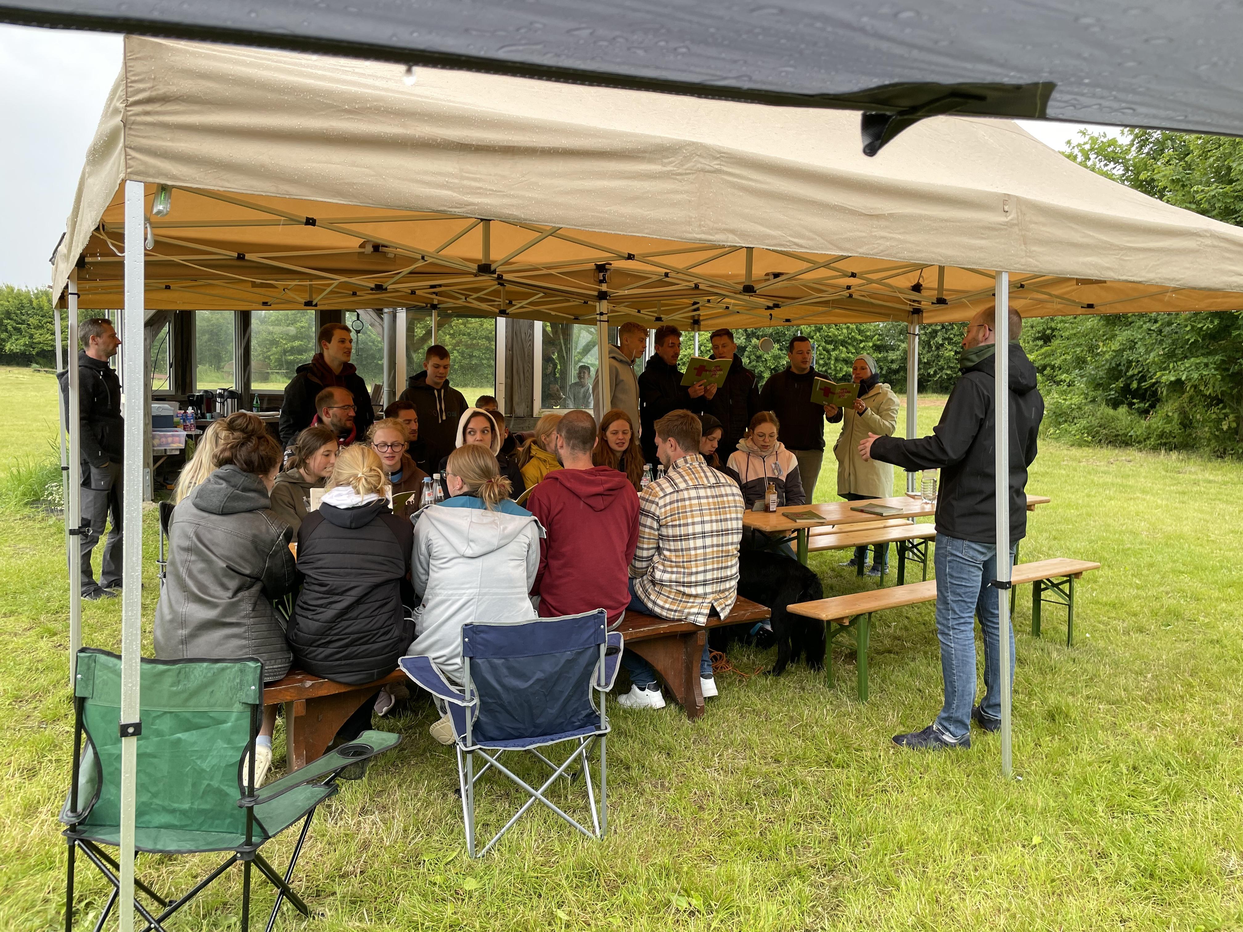 Am Sonntag fand zum Abschluss unser Jugendgottesdienst bei Regen und Wind unter Pavillons statt, bevor die Zelte schließlich abgebaut wurden.