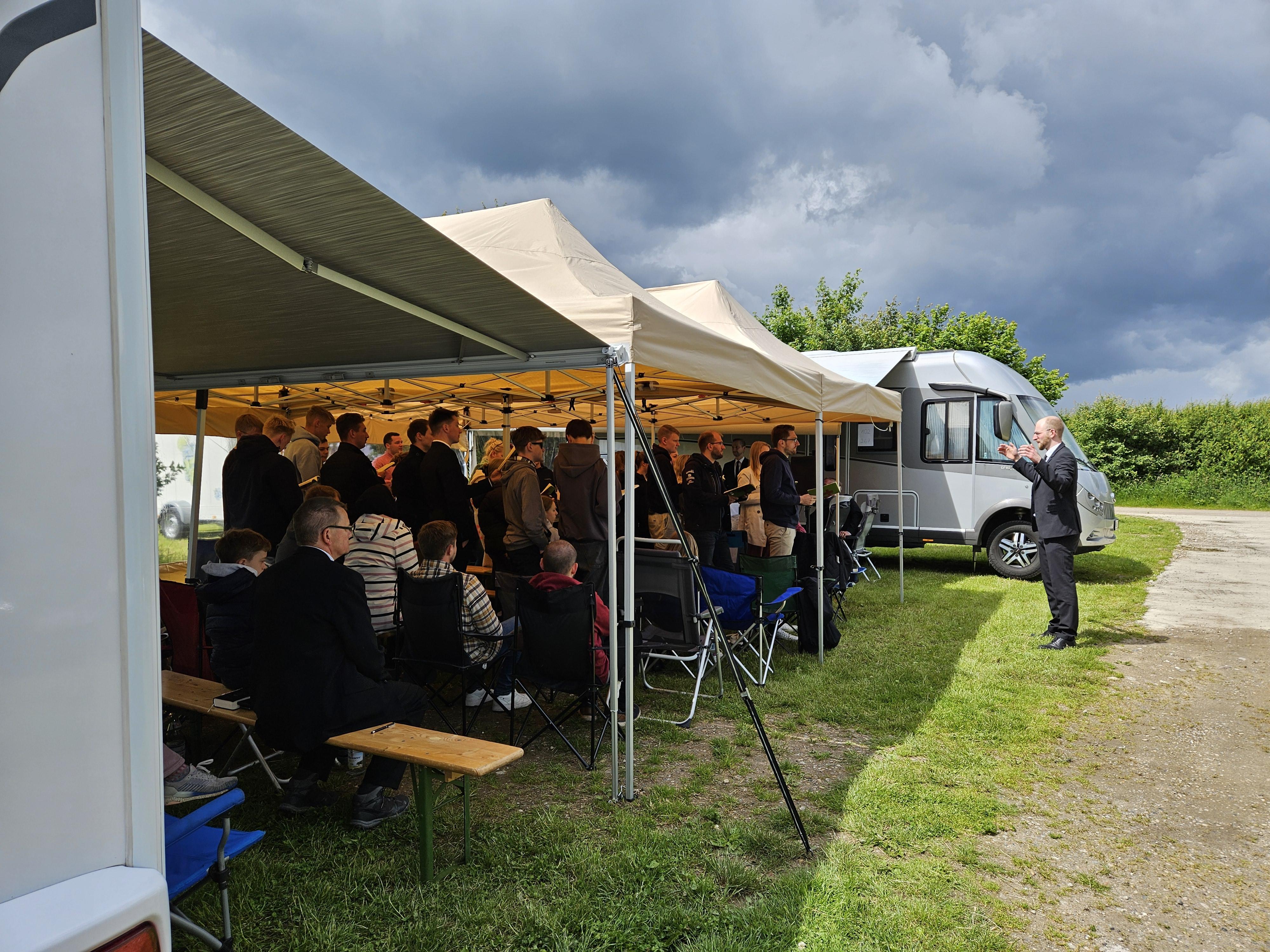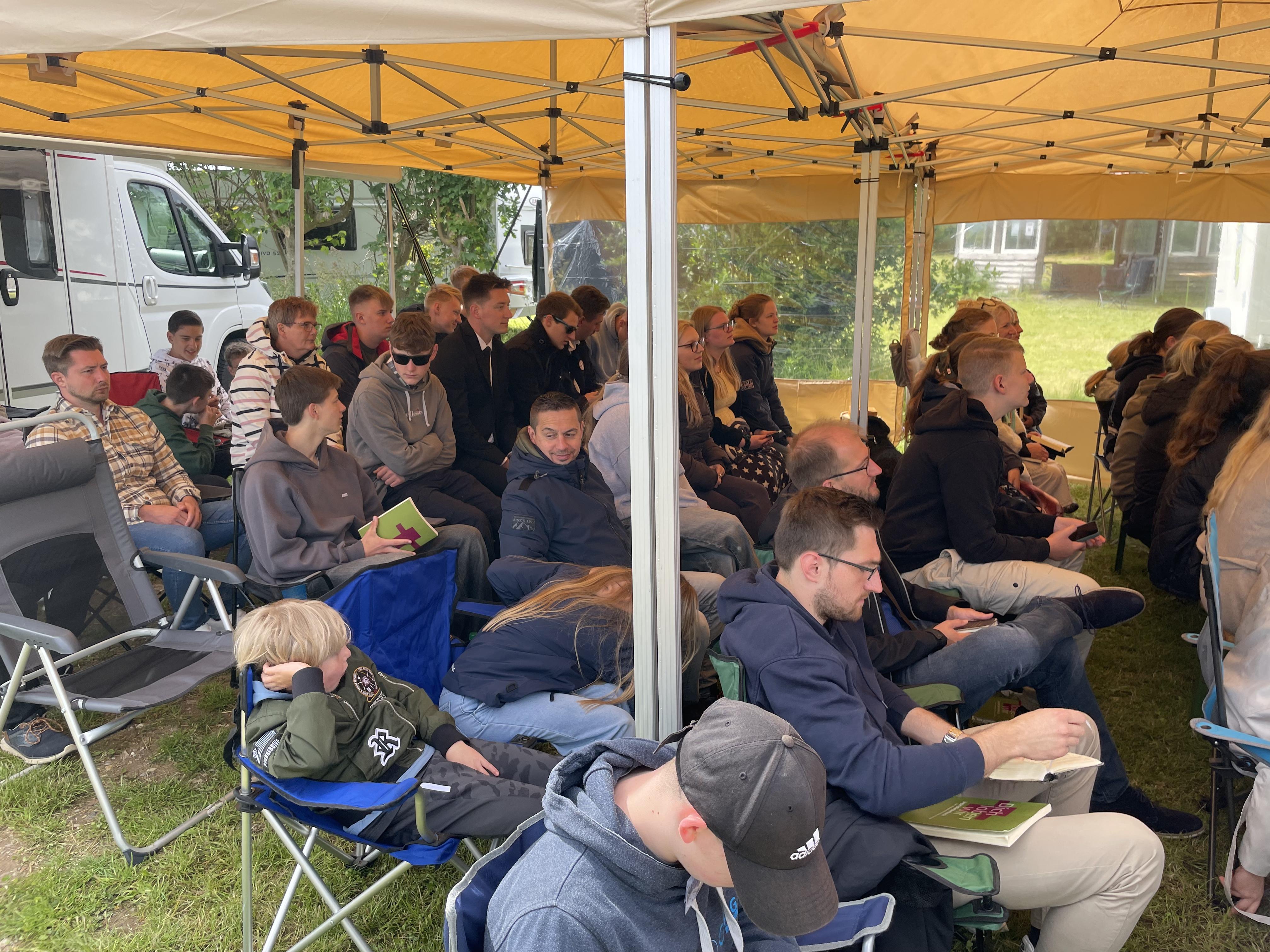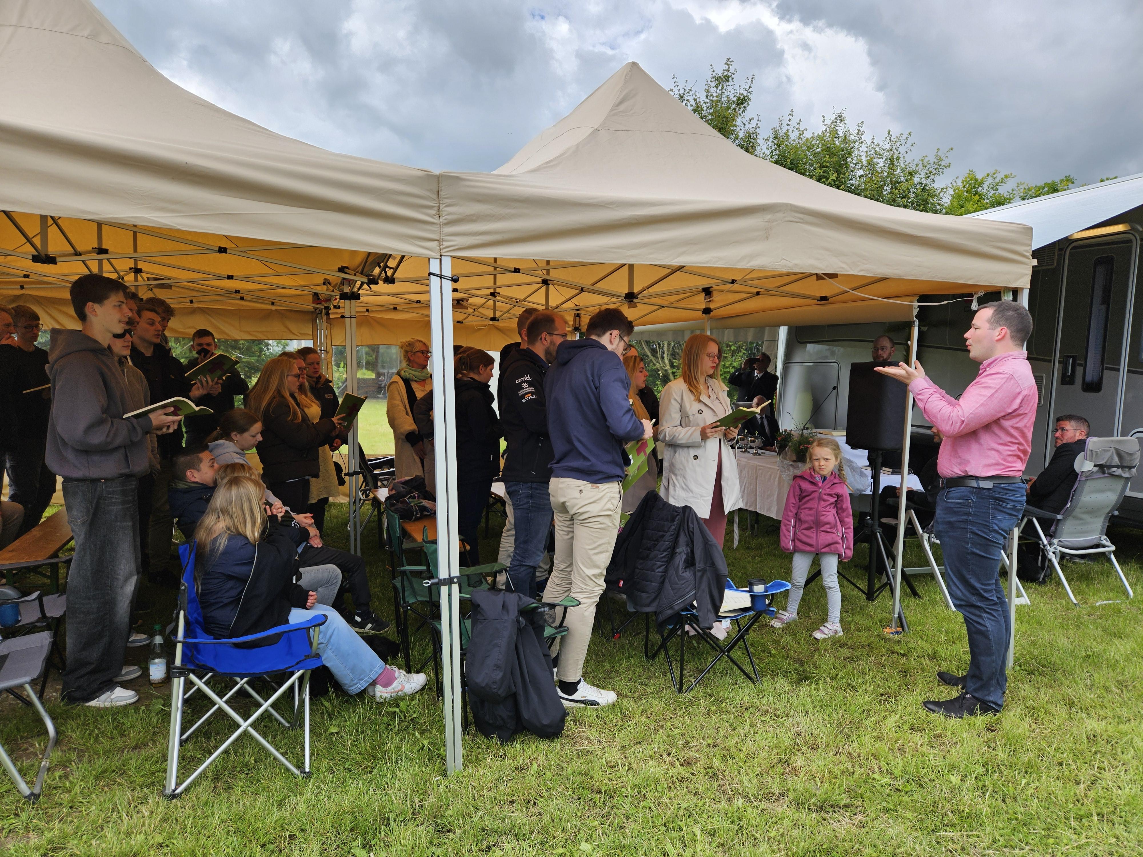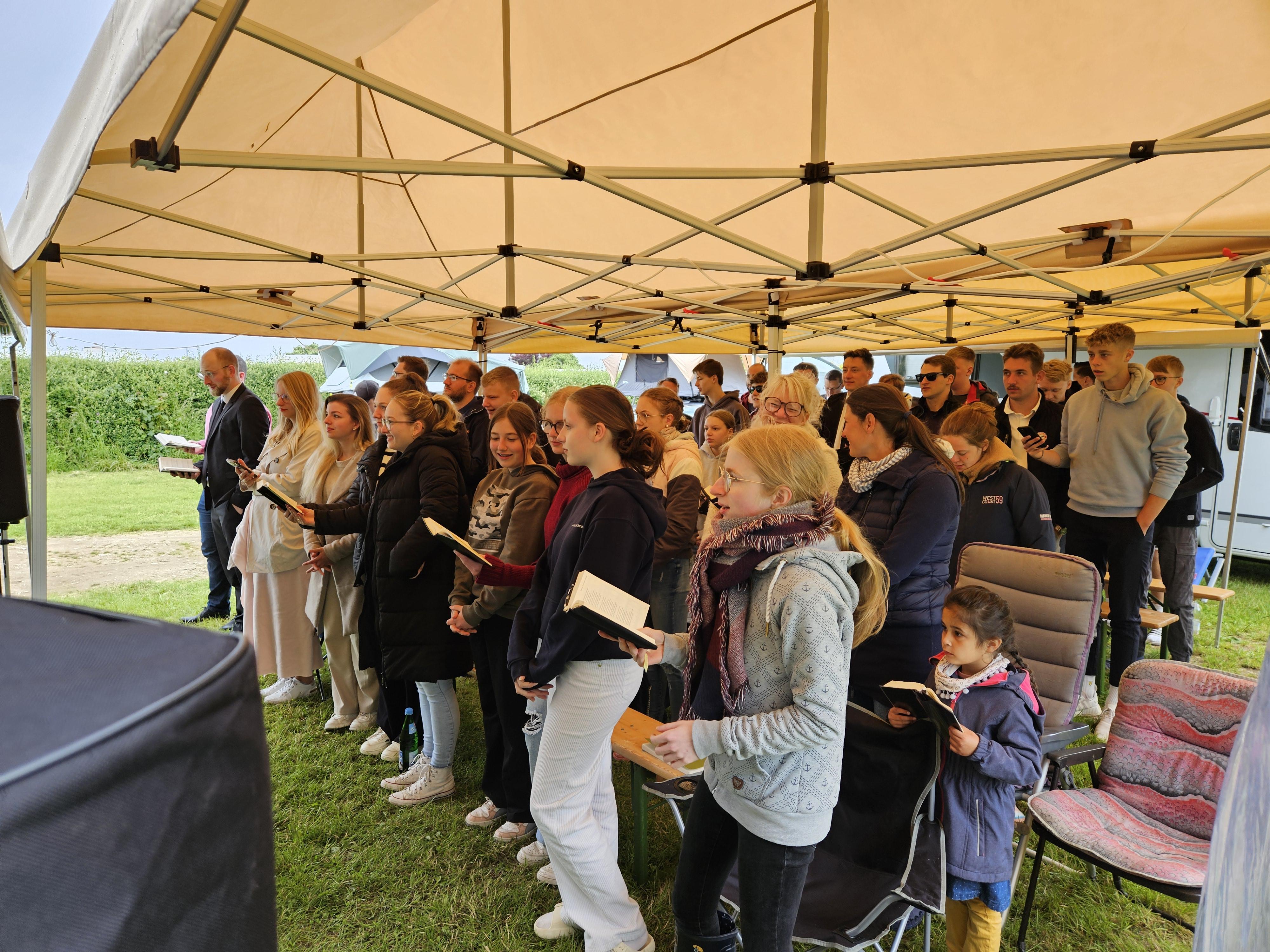 Am Sonntag fand zum Abschluss unser Jugendgottesdienst bei Regen und Wind unter Pavillons statt, bevor die Zelte schließlich abgebaut wurden.