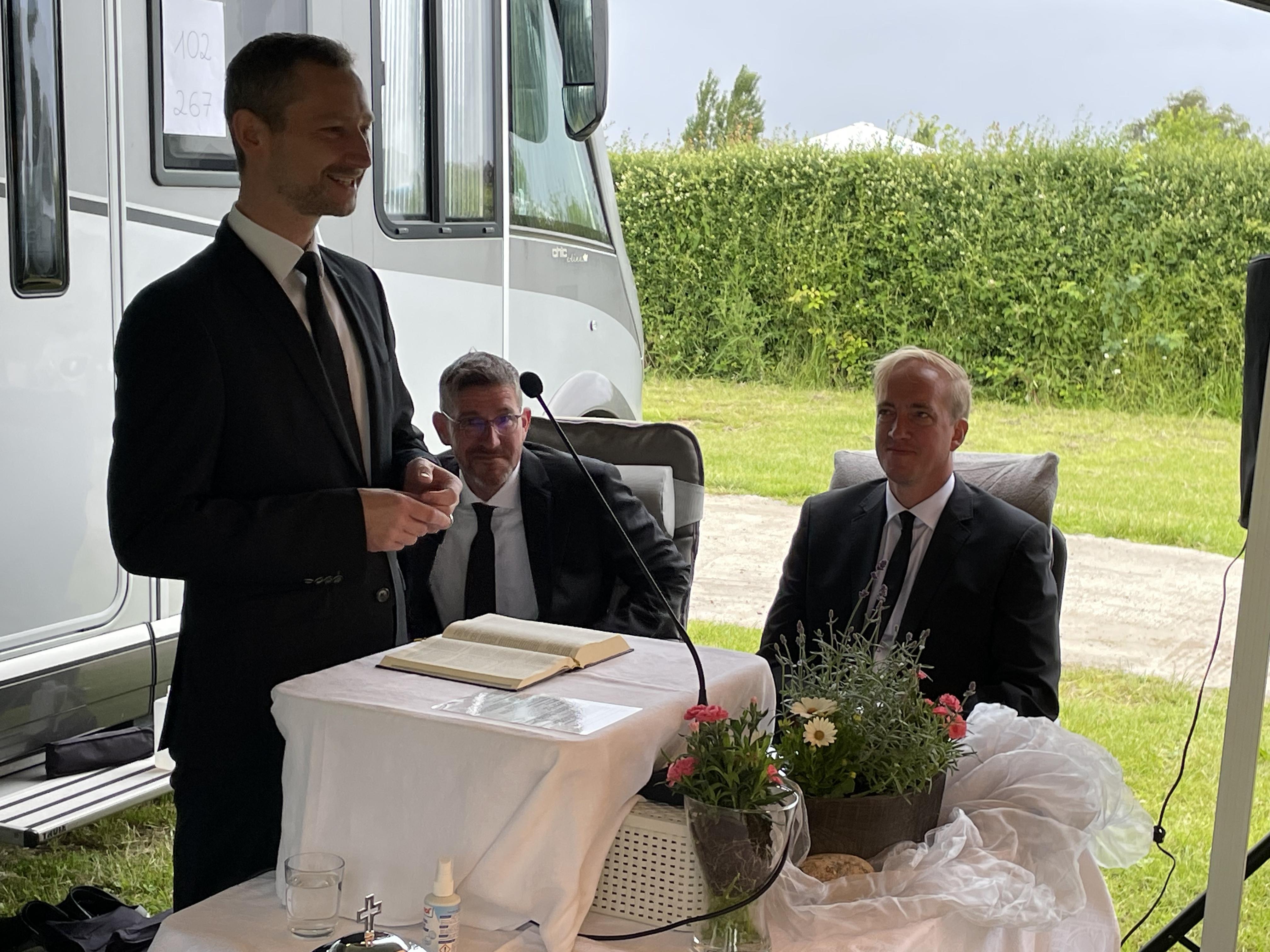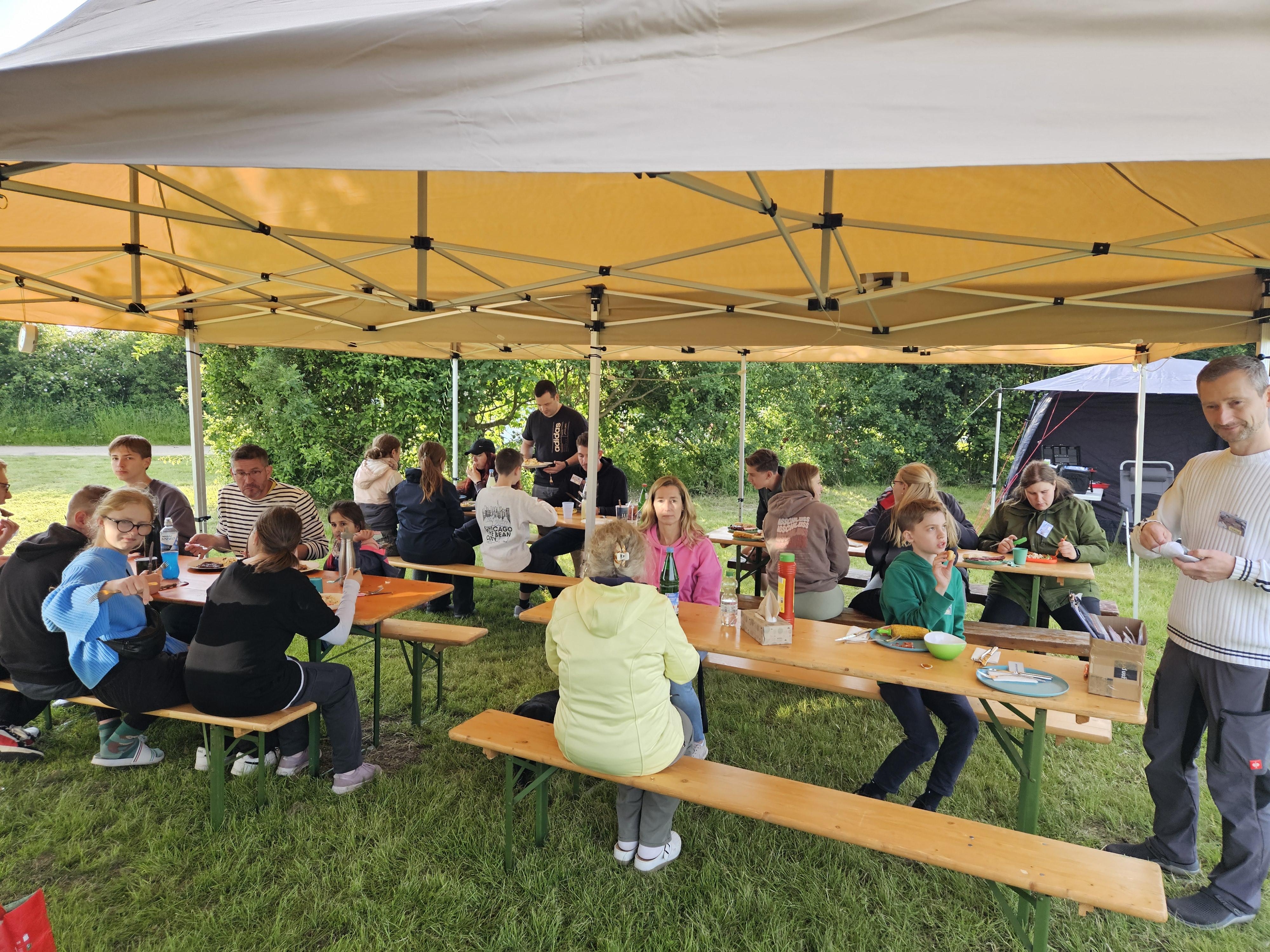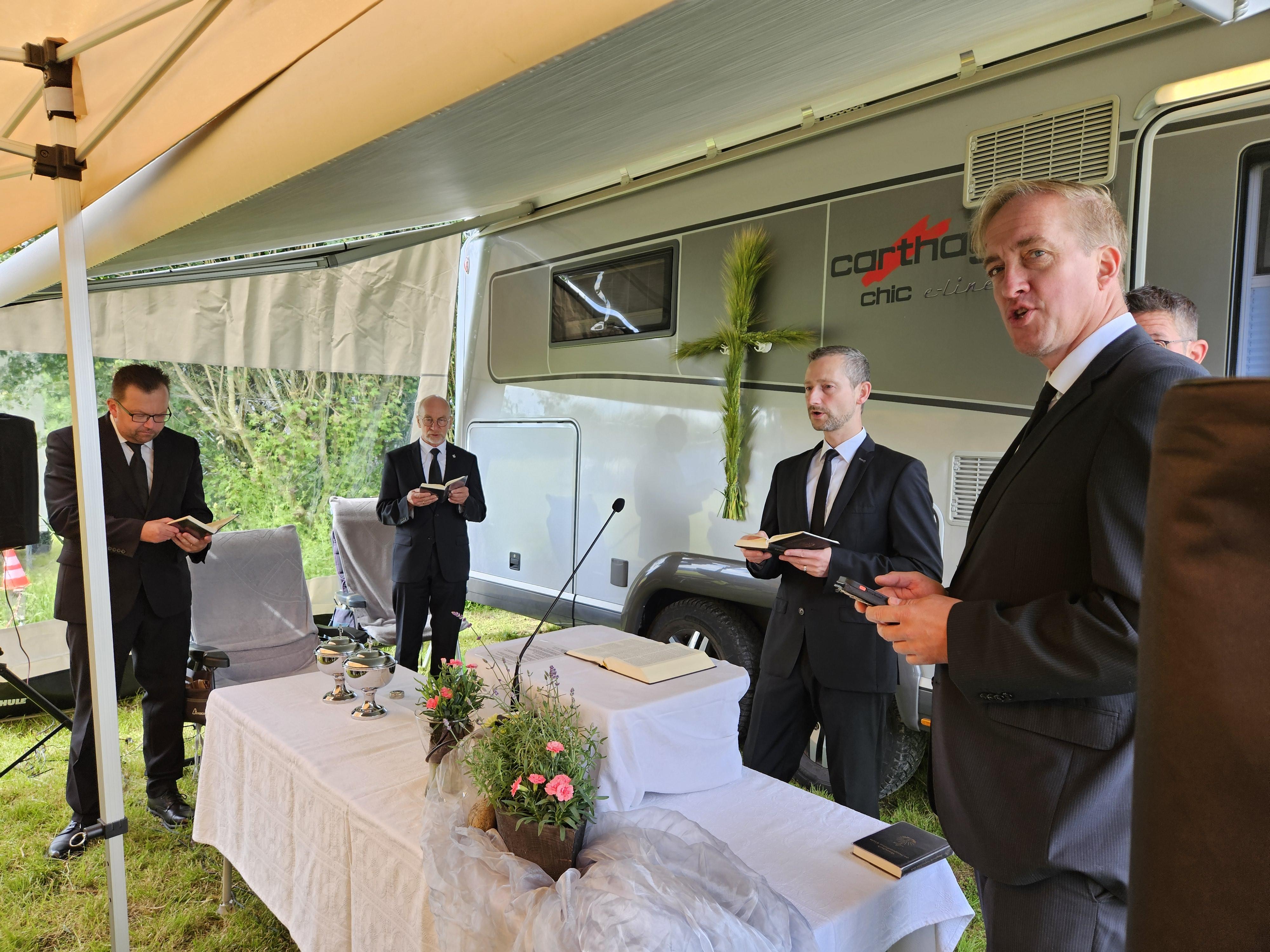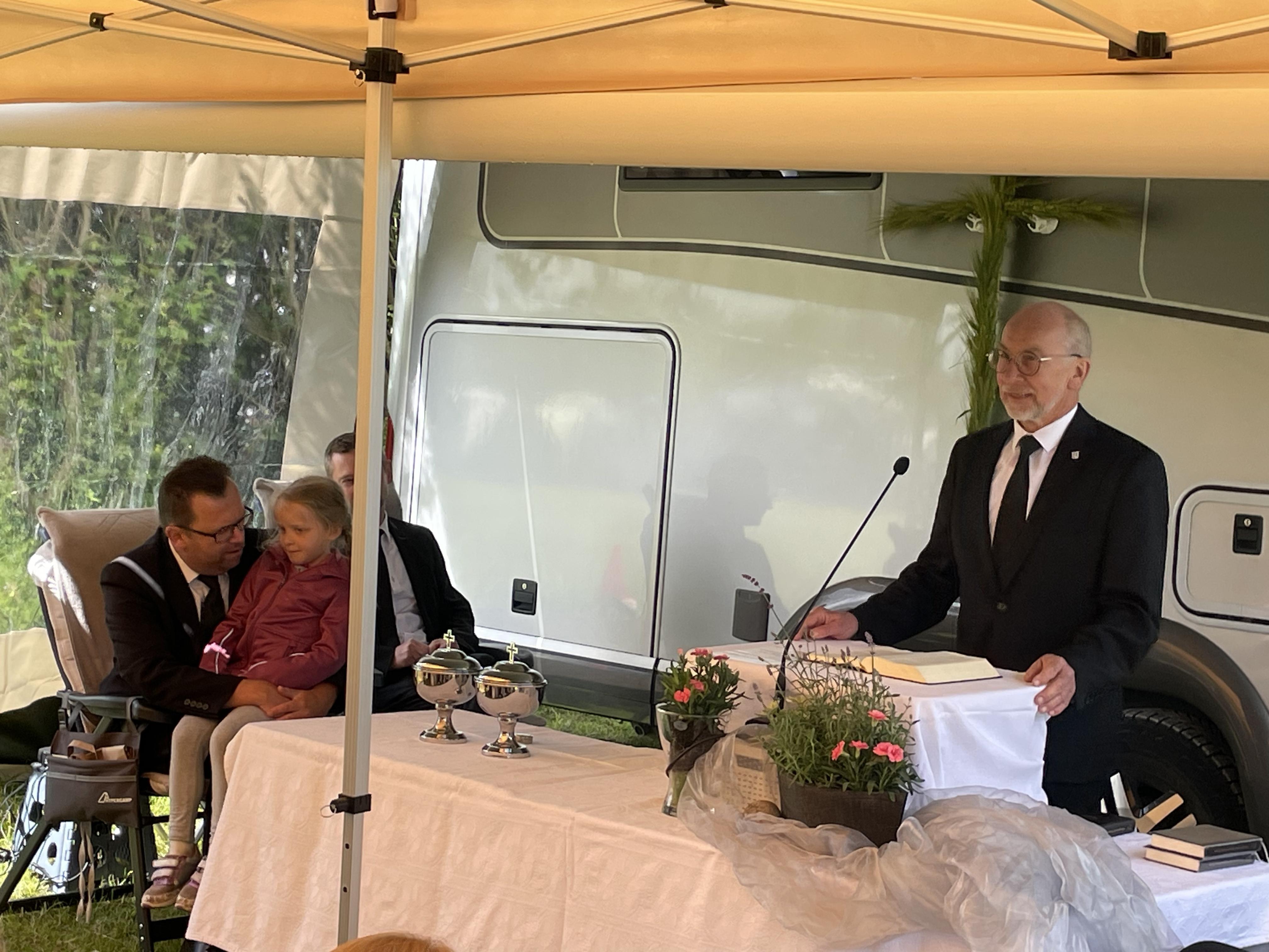 Am Sonntag fand zum Abschluss unser Jugendgottesdienst bei Regen und Wind unter Pavillons statt, bevor die Zelte schließlich abgebaut wurden.