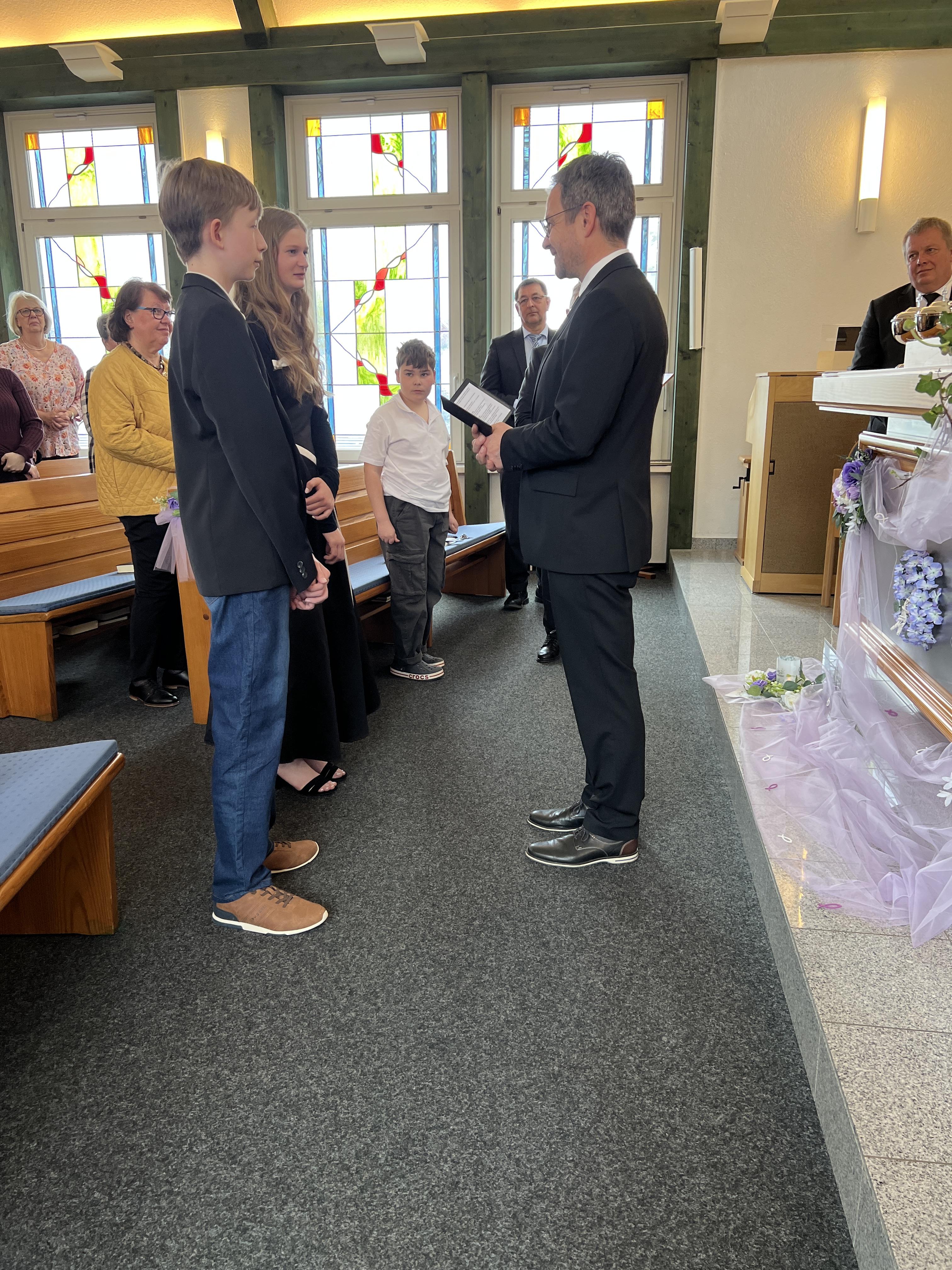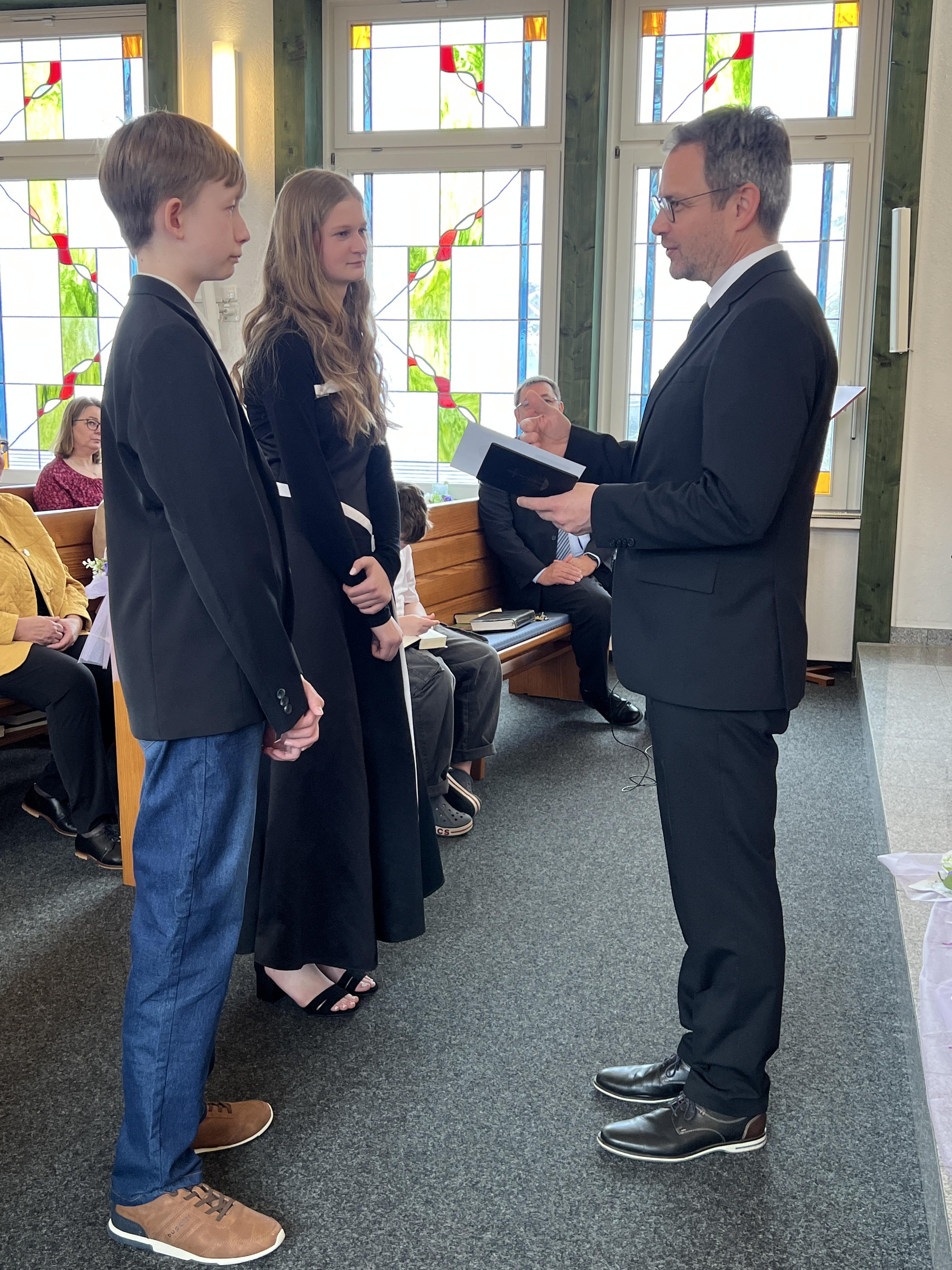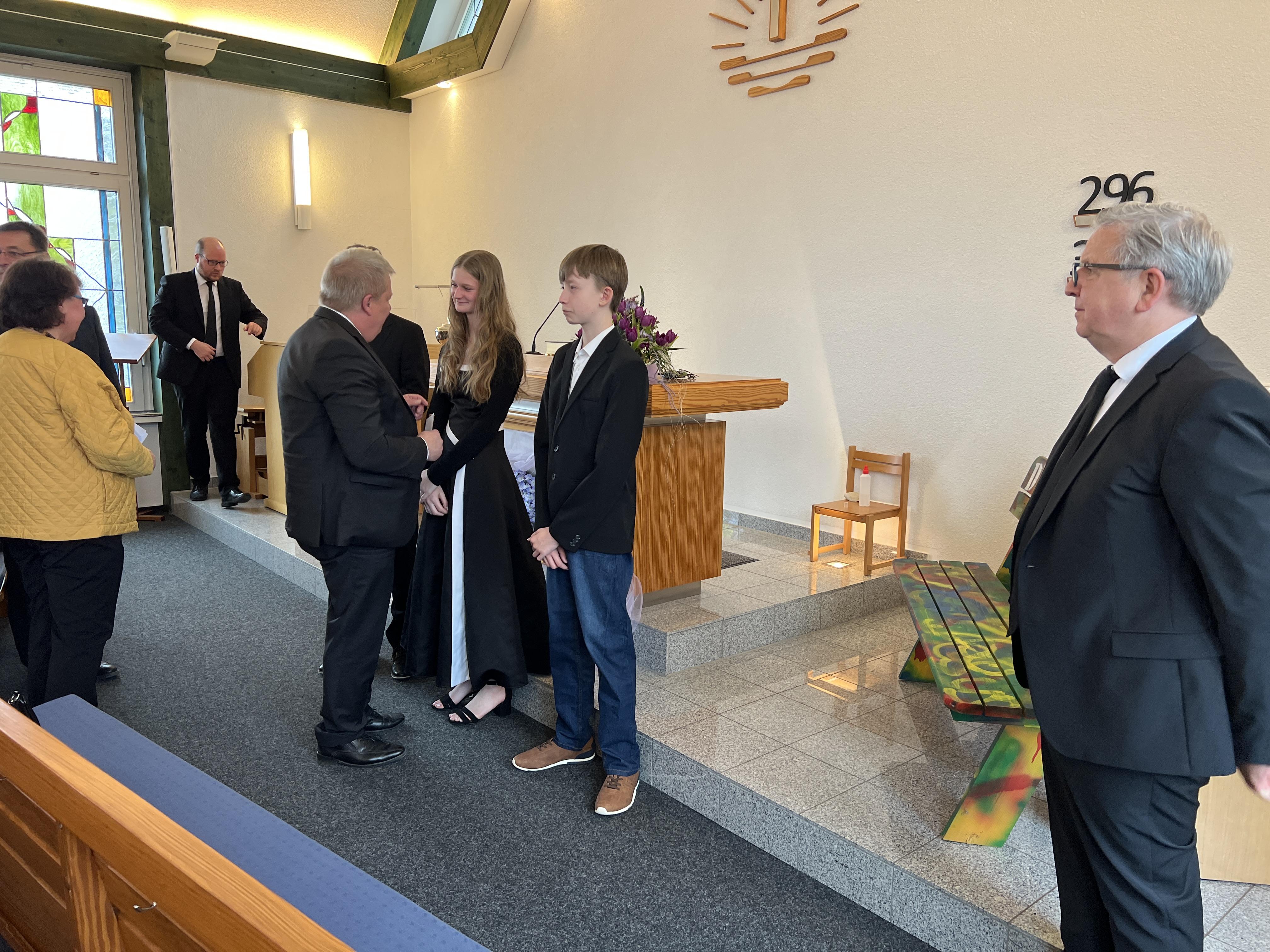 Nach der Sündenvergeung, und zur Einstimmung der Segenshandlung zur Konfirmation, trug der Chor das Lied aus der CM, Nr 328 vor: "Gottes Liebe, Gottes Gnad hat herrlich dich geführet, ... und weiter: Jesus nahm in heil´ger Stund dein Treugelöbnis hin, gab dir seine Liebe kund und schmückte Herrz und Sinn". Währenddessen traten Alberta und Lukas vor den Altar und Priester Koy hielt nach dem Chorlied die Konfirmationansprache. In seiner Ansprache hat er unter anderem den Konfirmationsbrief vom Stammapostel der Gemeinde vorgelesen. Danach sprachen beide das Konfirmationsgelöbnis mit den Worten: " Ich entsage dem Teufel und all seinem Werk und Wesen. Und übergebe mich dir, Vater, Sohn und Heiliger Geist, im Glauben, Gehorsam und ernstlichem Vorsatz, dir treu zu sein, bis an mein Ende. Amen". Jetzt erfolgte der Segen Gottes durch Handauflegung von Priester Koy. Anschließend hat die Gemeinde das Heilige Abendmahl gefeiert. Danach wurde das Schlussgebet gesprochen und der dreifache Segen Gottes gespendet, mit den Worten: „Die Gnade unseres Herrn Jesus Christus und die Liebe Gottes und die Gemeinschaft des Heiligen Geistes sei mit euch allen! Amen!“